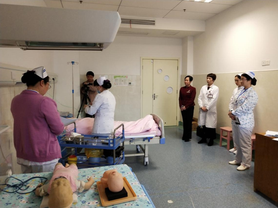 周云玲院长、蒋国英业务院长操作现场指导 此次比赛分为操作和理论两部分进行。首先进行的是通过模拟临床真实案例,围绕新生儿窒息复苏、中心管道给氧法展开操作竞赛。10个参赛队操作流畅,表现自如,圆满地完成了各项操作。5月9日上午进行了以理论考试和相关知识必答两种形式的竞赛。